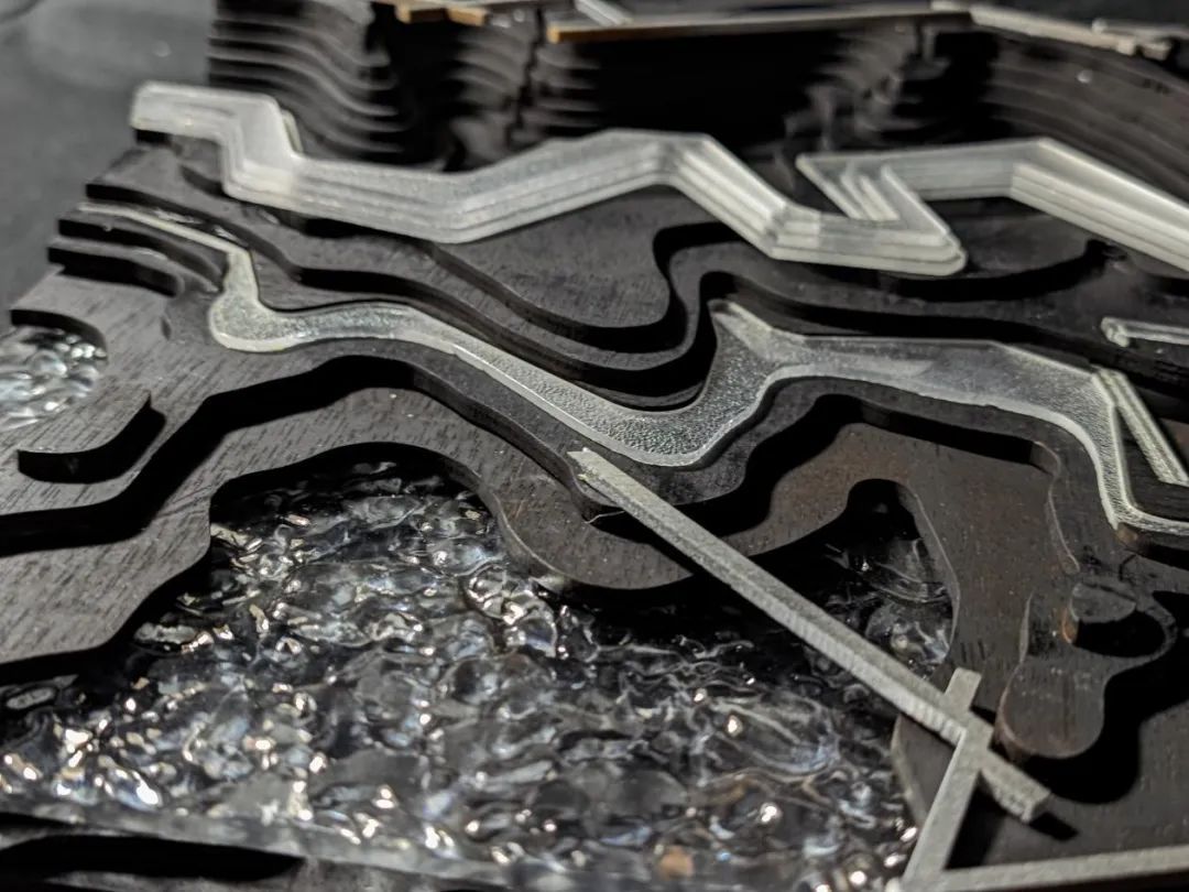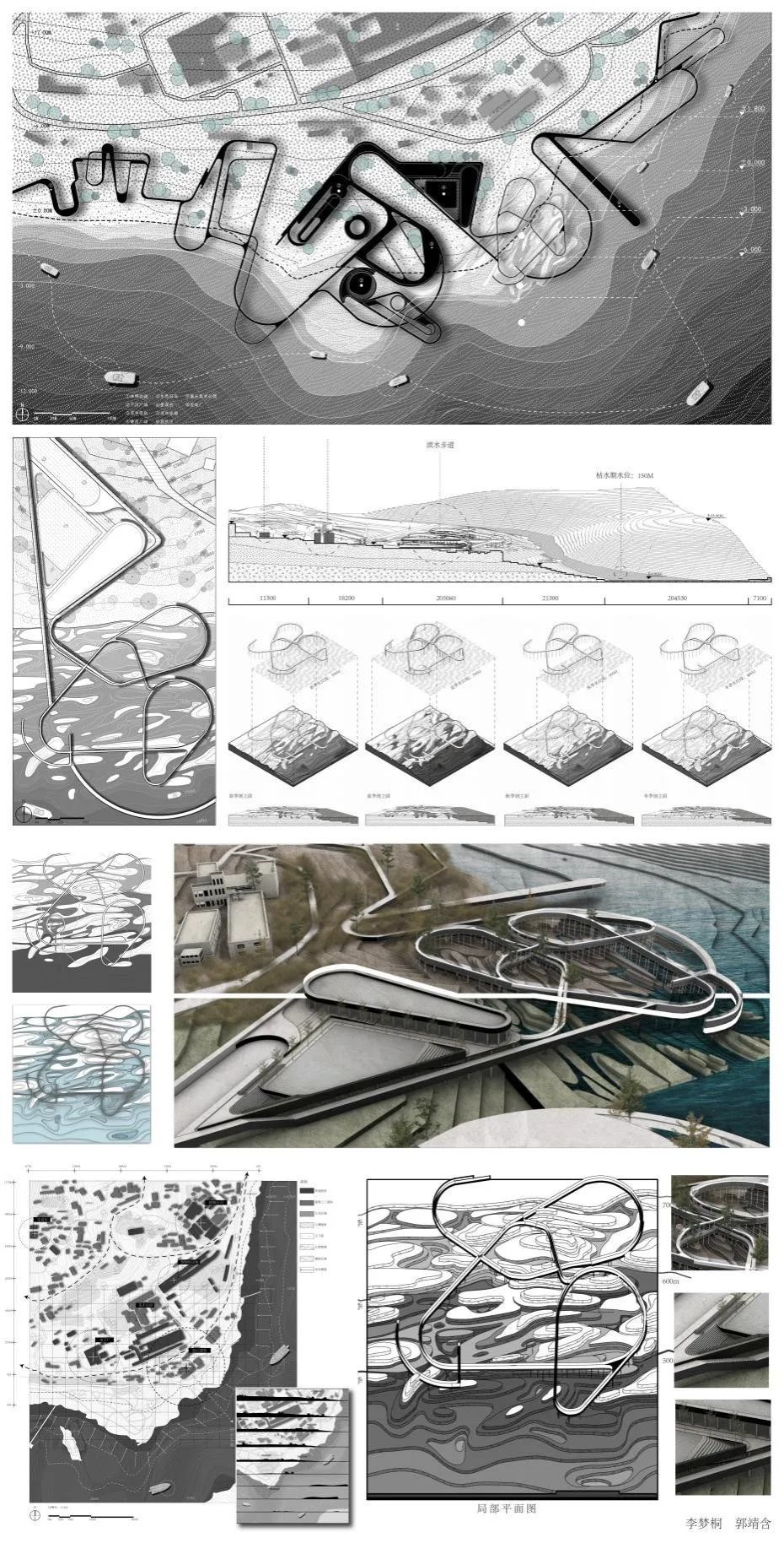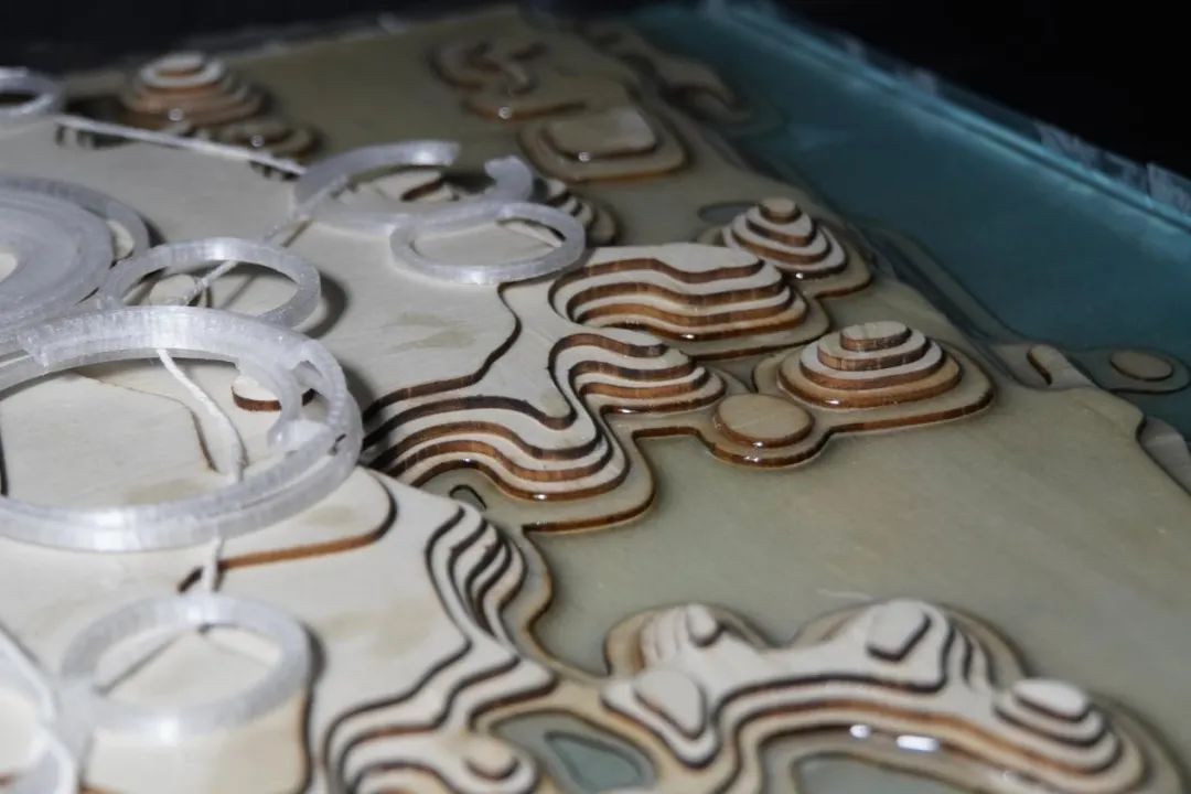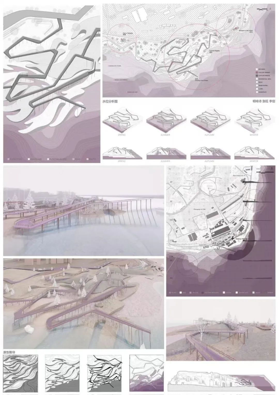 我们主要的设计方向是聚焦于人和场地的互动性,比如一个想做的主题是让人24h能亲水观水,所以做了很多将人从内陆引入滨江的道路,但是我们又希望人亲近水的同时,水也能自己去靠近人的空间,我们通过原有的河流素材概括了横向的湿地斑块,所以联想到在特定的节点做湿地空间,来配合不同季节的水位,消解了传统江岸轮廓的同时,引入较柔和的江水,然后我们不仅做了一些架空的观水廊道,还设置了下沉的广场空间,能够适应场地高差的同时,触碰到不同水位的江水,下面我们的模型配合亚克力做了两个不同季节水位的展示,以表现季节变化的湿地空间特征。