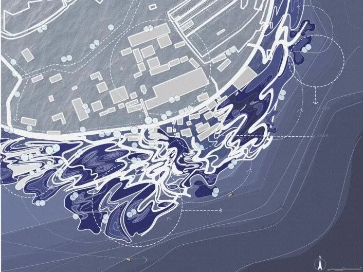 本方案以滩涂水文节律为核心,构建季相性弹性景观系统,称作“漂浮岛屿实验”。在形态上采用由规则几何形向自然形态过渡的设计语汇,模拟人工化设计向滩涂景观演化的过程,通过阶梯式台地组织空间序列,旱季形成亲水活动平台,雨季转化为生态缓冲带。采用简洁线性水渠来连接主河道与滞留池塘,利用潮汐动力实现水体自然循环,以此实现生态修复与游憩体验的有机统一。
