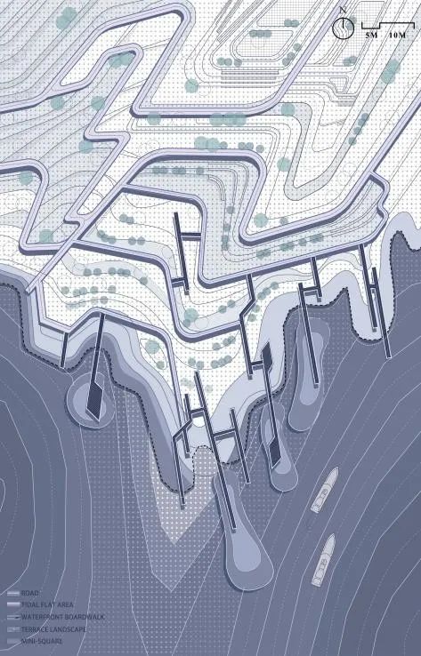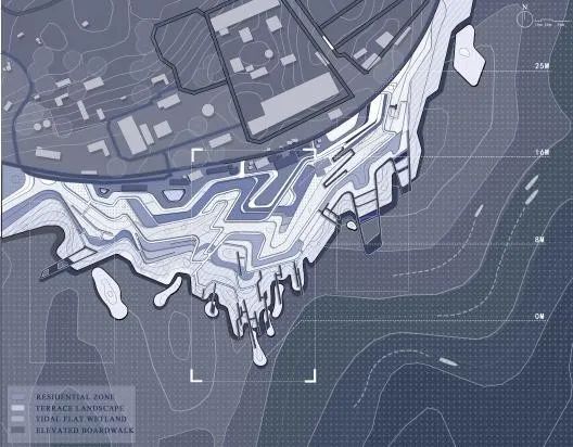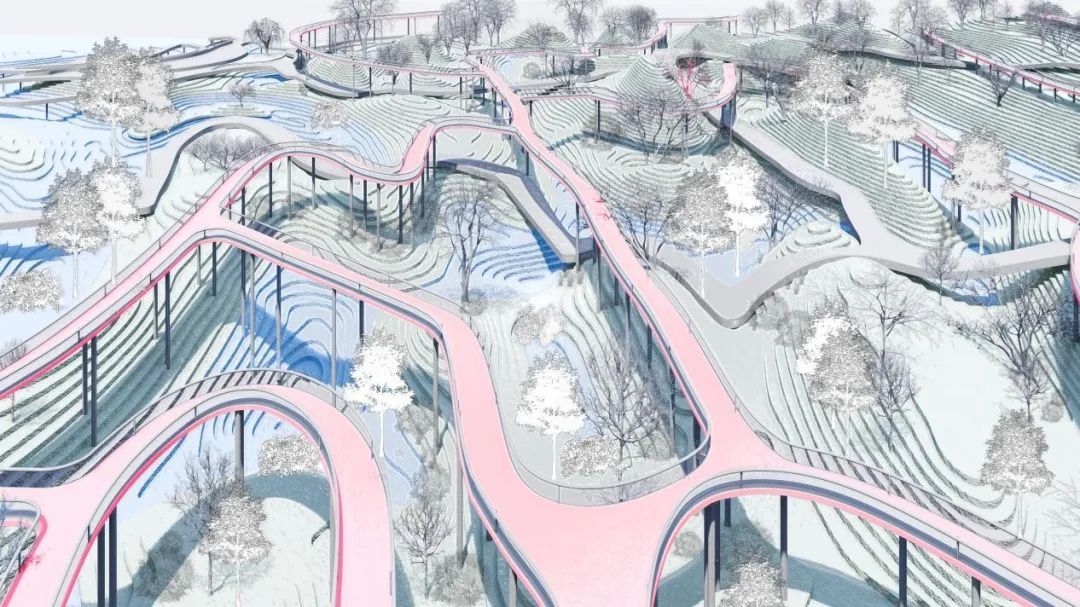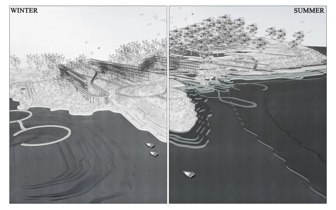 该设计为滩涂儿童公园。采用三级台地设计,分层应对不同季节气候下的水文情况。