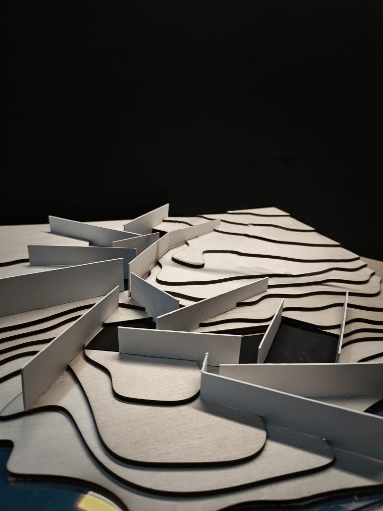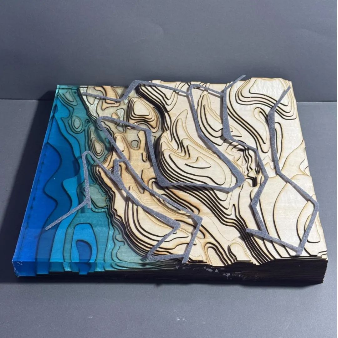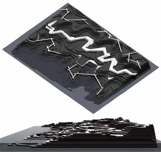 第二阶段:探索水作为催化剂如何塑造影响地形以及地形对水文的反作用。将提取出来的原型进行地形设计,探讨地形与水文关系,并进行场地标准化设计。同时开始制作手工模型和学习mapping图纸制作。