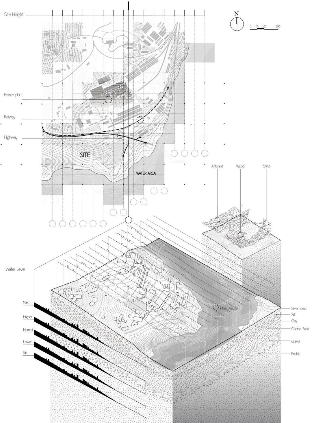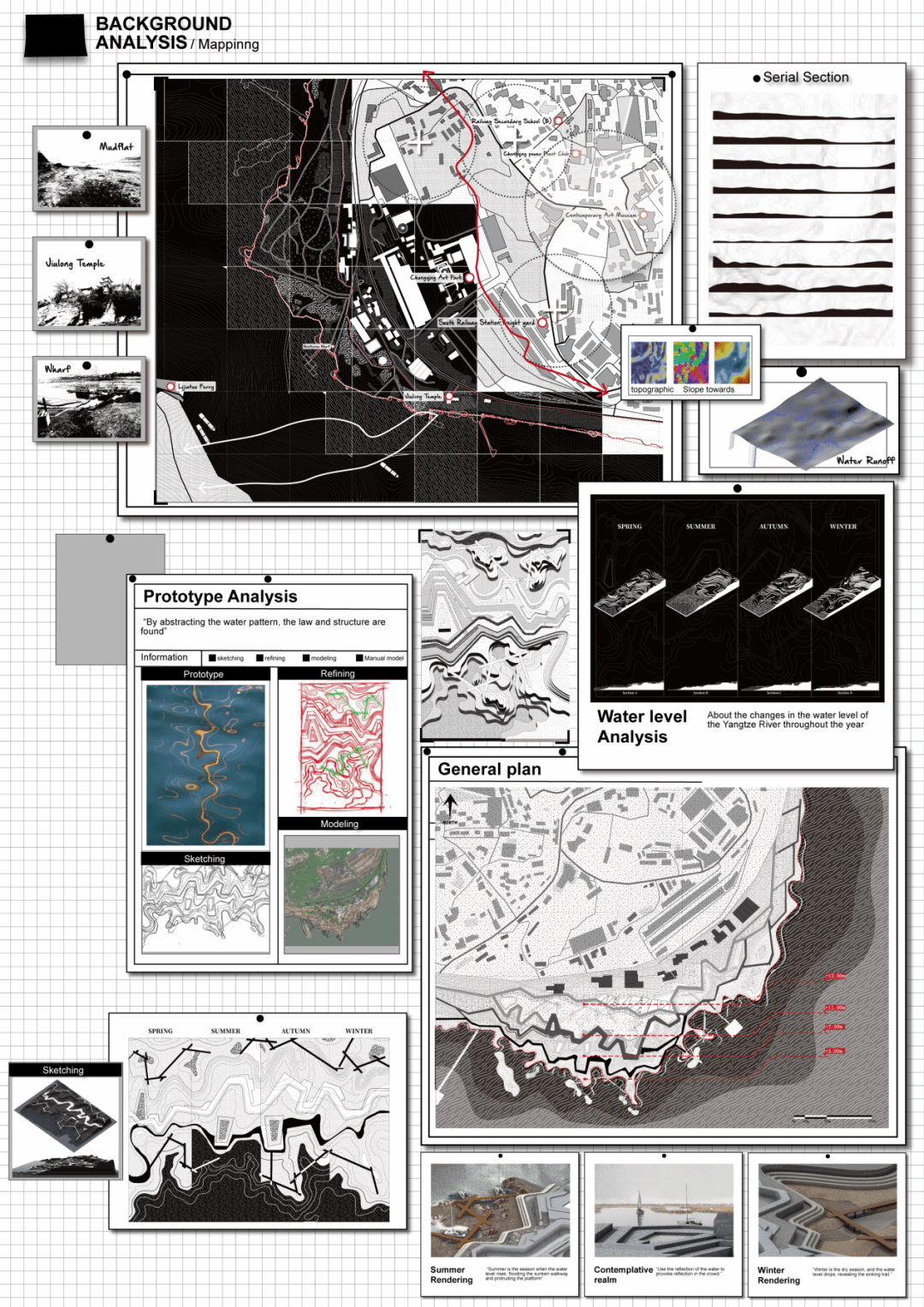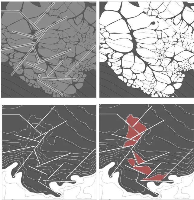 成果展示:作业分为三个部分,原型设计和场地设计。原型设计让学生们掌握高差关系并探讨水文与场地关系。并把原型置入场地,从整体塑造地形思考水的置入方式。