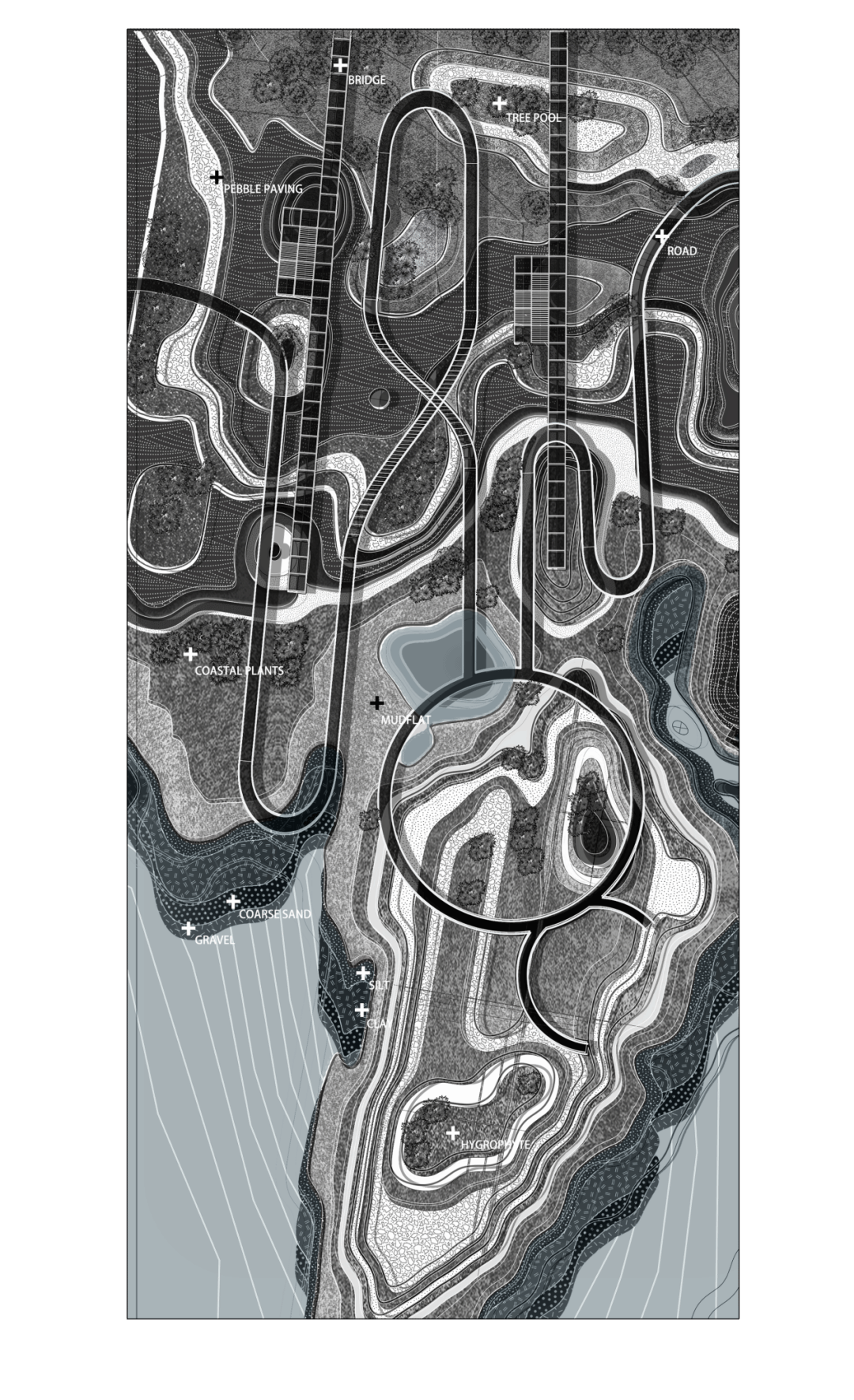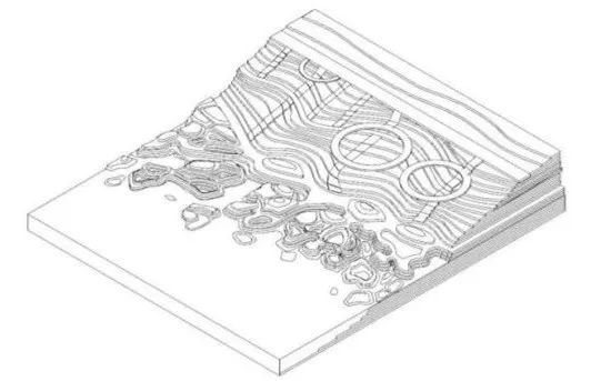 考虑到水文节律中的季节性水位涨落与单日内的潮汐变化,不同海拔高度的沉积池中,会留下不同季节、年份的沉积物,沉积的数量、成分与位置也会随着水文条件而改变,进而让水文变化带动景观的动态变化,在场地中留下潮汐的记忆。