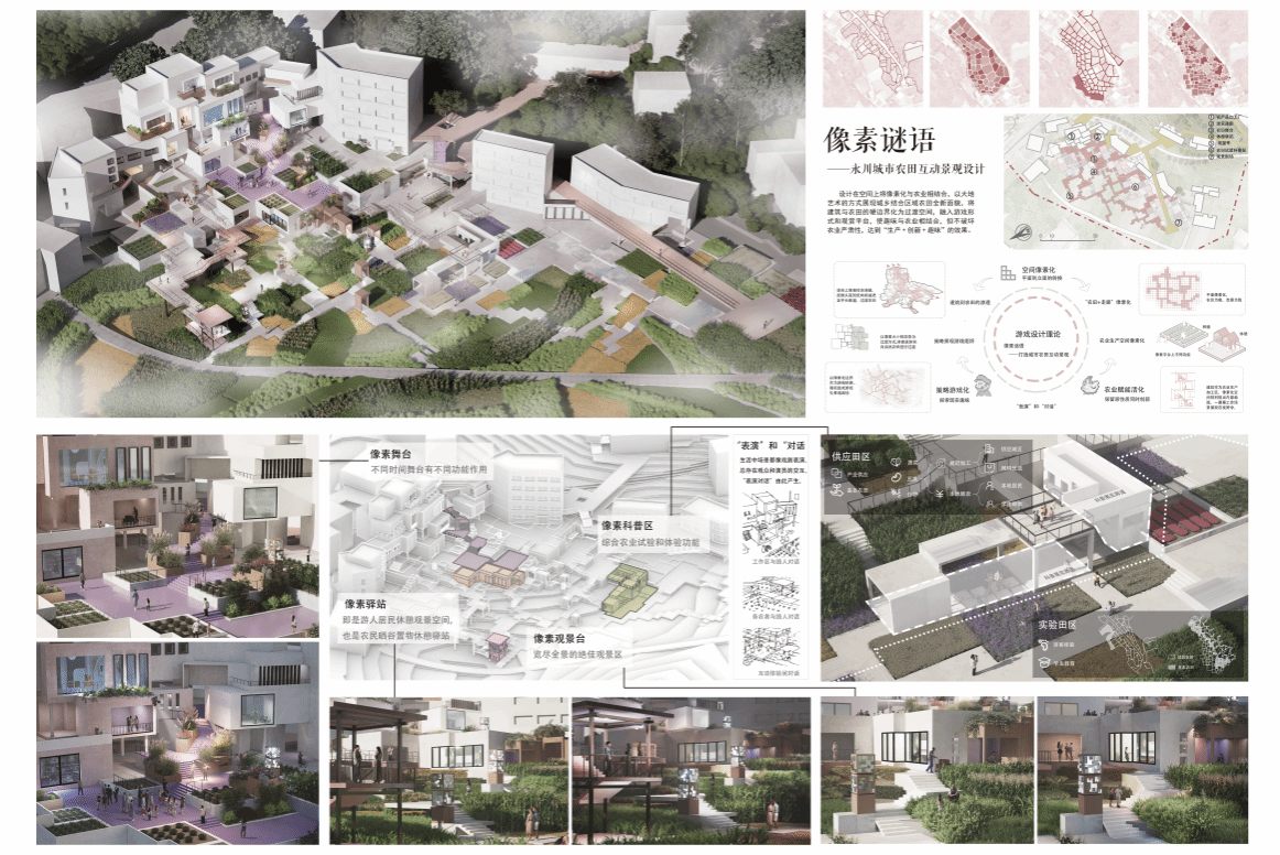 小组以打造“Z时代”互动城市场域为主题,分为盲盒秘境,像素谜语和元域共振三个部分,在游戏设计理论的指导下,分别采用盲盒,像素化,共振的设计方法,更新城市形态,唤醒城市活力,传承三线精神。