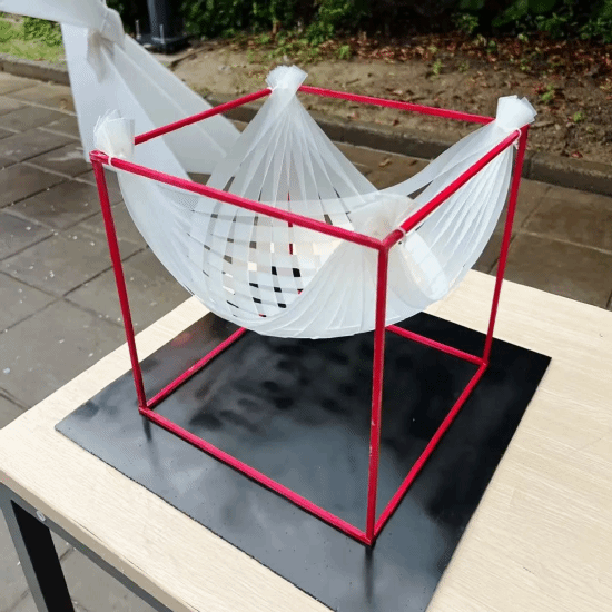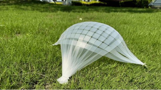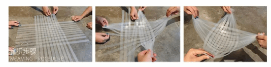 在此基础上,考虑到太空特殊的环境条件和建设需求,为了在星球上建设适宜的居住单元,融入快速搭建理念,实现“一拉成型”的便捷建造方式。在星球表面,资源有限且环境恶劣,传统的复杂建造方式难以实施。因此,这种“一拉成型”的方式具有独特优势。在形成二维编织平面后,通过提拉四角使节点自动旋转、锁定,形成悬链线,带动平面竹编网络快速转化为三位空间框架。这种创新的“一拉成型”的建造机制,不仅保留了传统工艺的编织韵味,还通过结构自锁定原理实现高效搭建。整个过程无需复杂组装,大幅缩短建造周期,同时保证结构在展开状态下的力学稳定性,使传统工艺的智慧与现代建造的效率完美融合。