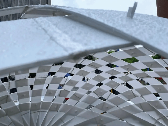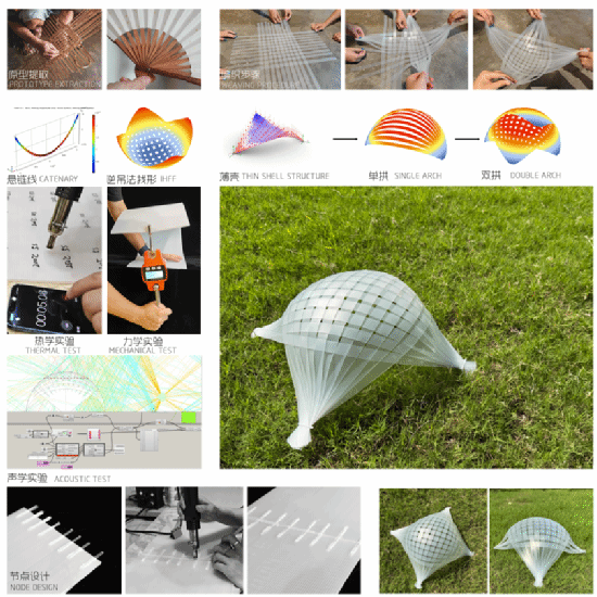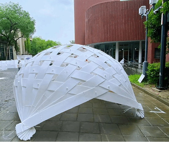 四川美术学院建筑与环境艺术学院代表队以东方传统工艺为灵感,将竹编与折扇两种承载千年智慧的技艺解构与转译,实现文化符号与现代建造技术的有机融合。设计从结构力学与形态美学双重维度切入,将竹编工艺的经纬编织逻辑转化为三维空间网格体系,构建具备自承重能力的立体框架结构;同时,提取折扇扇骨偏移牵拉形成的双曲拱壳形态,运用参数化设计方法优化曲面曲率,形成沿纵向渐变的薄壳体系。