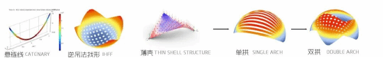两种原型要素通过空间叠合实现创新整合。竹编骨架系统和折扇拱壳体系共同承担竖向荷载,竹编的模块化编织节点确保结构的可复制性与建造效率;横向折扇拱壳体系则通过构件间的预应力牵拉作用,增强整体结构的空间稳定性,又在视觉上营造出轻盈飘逸的韵律感。这种双元结构体系突破了传统工艺的平面表达局限,使二维编织肌理与三维曲面形态产生对话,创造出兼具力学效能与美学价值的复合空间。