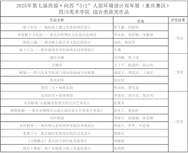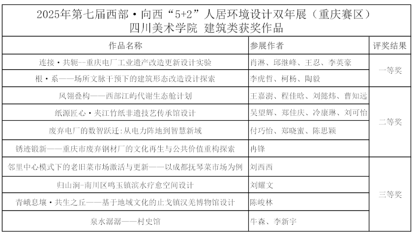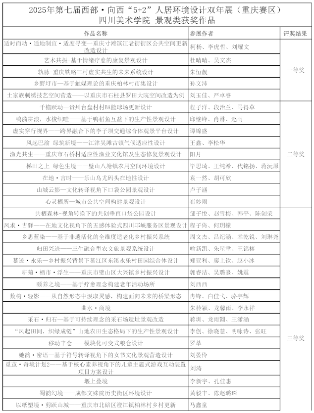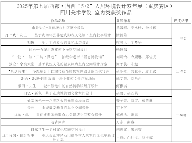 近日,由重庆市教育委员会主办,四川美术学院承办,建筑与环境艺术学院承担组织实施工作的2025年第七届西部·向西“5+2”人居环境设计双年展(重庆赛区)活动圆满落幕。赛事筹备组织规范、评审公正、成效显著。经重庆市教育委员会审核并通报表扬的评选结果显示,此次赛事征集的作品覆盖重庆20多所本、专科院校,共评选出一等奖23项、二等奖44项、三等奖83项。