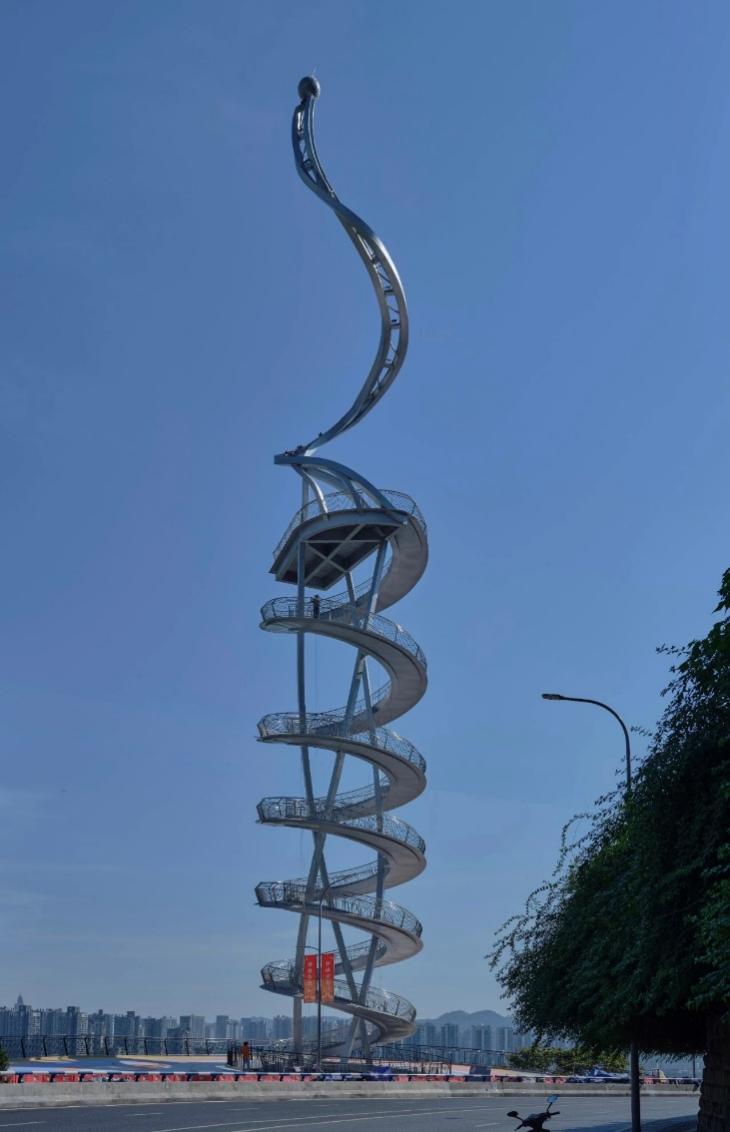 城市考察第一站,风景园林系主任王平妤副教授全面讲解了“中岛艺路”长江灯塔的结构设计创新与建造过程。长江灯塔位于长江文化艺术湾区的美术半岛入口处,是美术半岛重要的地标性建筑。建筑由上部灯塔和下部景观建筑组成,塔高63米与长江6300公里总长呼应,崖底距塔尖99米。在结构上采用双轴扭曲拱加单侧斜柱体系,突破传统灯塔形态,视觉上是一根似“飘带”环绕向上的9层螺旋楼梯,自下而上逐渐舒张,寓意积极向上,成为点亮艺术生活的当代之窗。为解决风作用下的稳定性、结构大震下的安全性及上人舒适度等问题,灯塔塔身结构采用弧形箱梁+弯扭柱形成稳定的结构体系;下方景观建筑采用“斜柱+斜拱+箱型钢梁”形成整体结构体系。在施工技术上,项目通过运用点云技术,通过逆向工程测量仪器得到产品外观表面的点数据集合,克服了复杂地形下的建筑安装。参数化设计制作保证了非线性建筑(弧形、曲面等)准确建立参数化模型。该项目为重庆美术公园提供了一个具备美术信息传播、休憩观景、艺术创作基地的城市空间。建环学院师生通过创新性的结构体系使这个与城市景观高度互动的标志性建筑在极端地形条件下得以建成,是四川美术学院建筑与环境艺术学院用设计服务城市环境高质量发展的代表性创作项目。