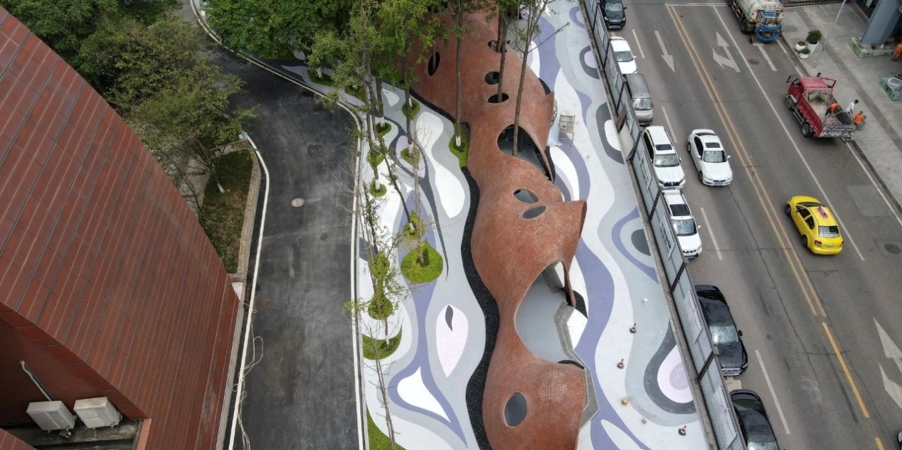 第二站,王平妤老师介绍了川美黄桷坪校区涂鸦艺术廊项目的形态设计探索过程与建造材料的创新。该项目位于重庆市九龙坡区黄桷坪正街川美大门院墙与人行道交界处,占地约368㎡,总长43m。项目采用数字建造的方式,科学把控艺术形体,使得技术可以更好地融入美学观念。在结构分析与优化中,与相关专业人员进行联合研究,保障了其绝对的安全与稳定性。