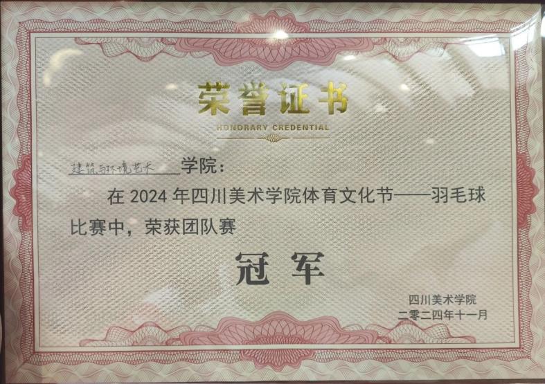 2024年11月24日,四川美术学院体育文化节系列比赛的首个团队赛——羽毛球团队赛冠军出炉,建筑与环境艺术学院荣获冠军!