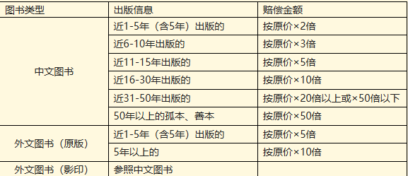 (2)遗失赔偿:读者遗失图书向流通部报告,并赔偿原书。如无法赔偿原书则视遗失图书的情况按以下条款罚款: