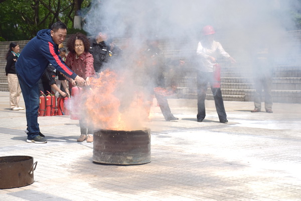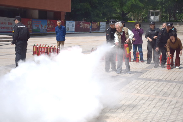 讲座结束后,离退休老同志现场学习了灭火器的使用方法,体验了用干粉灭火器扑灭初起火灾的过程,提升了初起火灾的自救能力。
