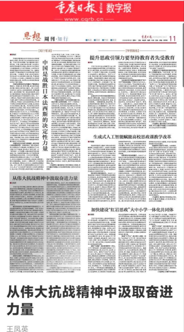 今年是中国人民抗日战争暨世界反法西斯战争胜利80周年,铭记历史、缅怀先烈,弘扬伟大抗战精神,意义重大而深远。9月1日,《重庆日报》思想周刊刊发我校马克思主义学院王凤英同志的理论文章《从伟大抗战精神中汲取奋进力量》,这是我校马克思主义学院在学校党委领导下坚持思政课建设与党的创新理论武装同步推进的成果和体现。