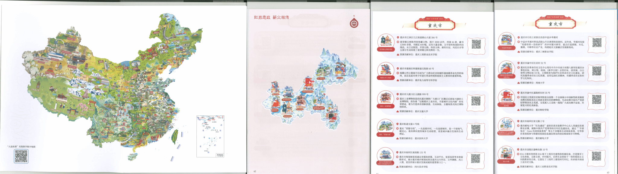 近日,在重庆市教育工委、重庆市教委的指导下,学院积极发挥学校的学科专业优势和重庆市高校红岩思政研究中心的平台优势,完成了重庆市高校提供点位、路线、专题等内容的遴选和设计,助力师生开展“行走的思政课”“场馆里的思政课”“田间地头的思政课”,形成丰富实践资源,受到大学生点赞欢迎。作为“数字地图”的姊妹篇,“手绘地图”生动反映了新时代大学生爱党爱国、追求真理、奋发昂扬的精神面貌,表达了广大青年听党话、跟党走、努力担当民族复兴重任的坚定信念,为全市乃至全国高校更高质量开展“大思政课”建设提供了良好示范。