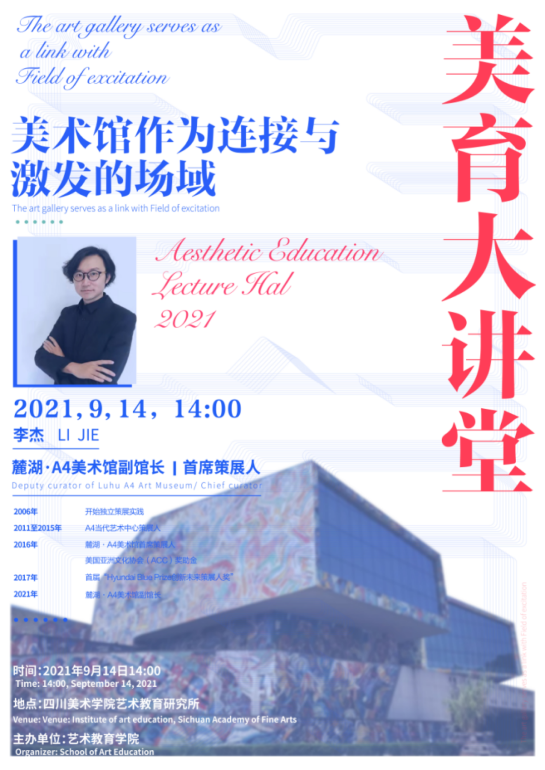 2021年9月14日,四川美术学院艺术教育学院邀请到了A4美术馆的副馆长、首席策展人李杰老师亲临艺术教育学院,给大众分享讲座——《美术馆作为连接与激发的场域》。