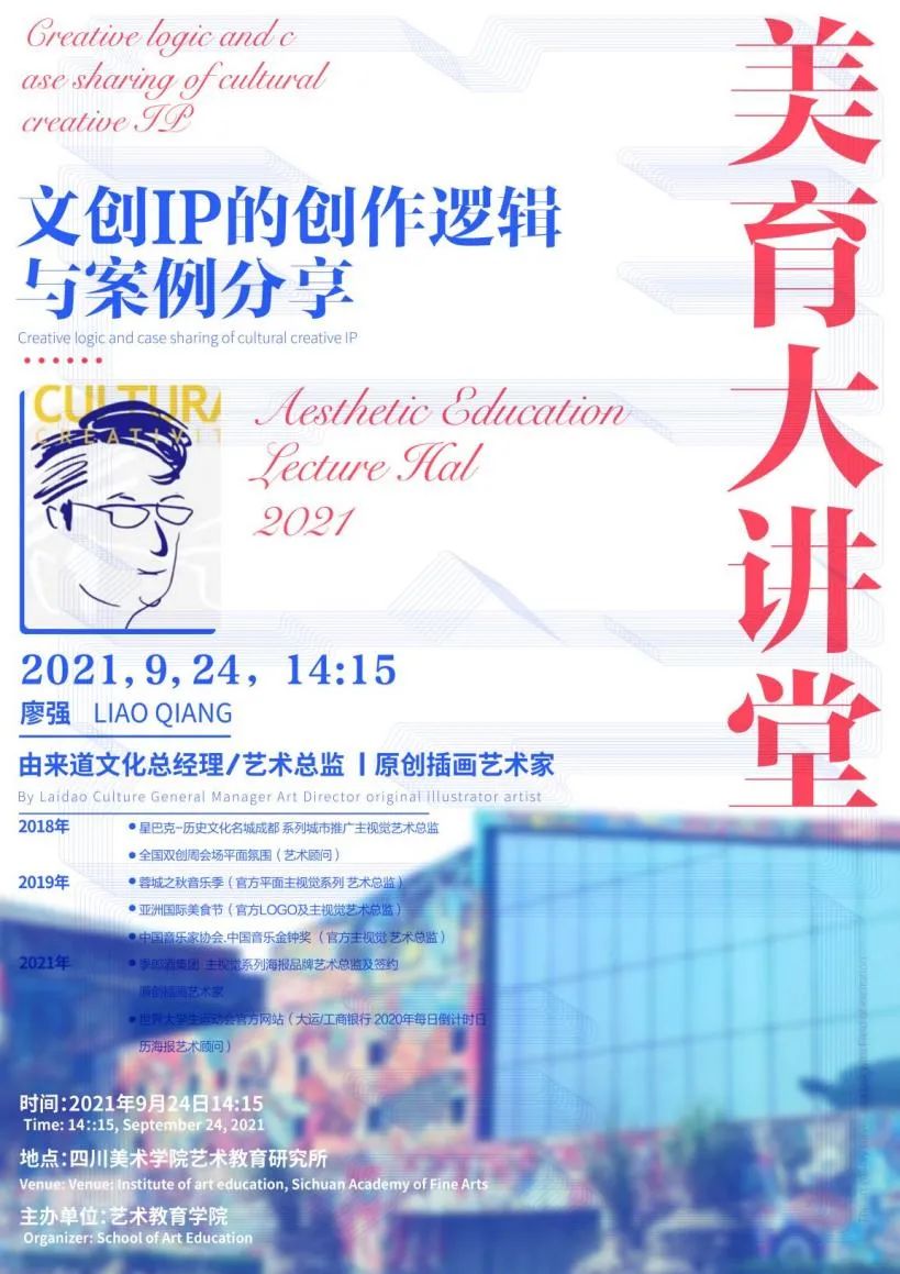 2021年9月24日,艺术教育学院邀请由来道文化总经理、艺术总监、原创插画艺术家廖强老师带来讲座《文创IP的创作逻辑与案例分享》,分享自己的多年经验——如何建构一个完整有效的、具有人格化特征的IP营销闭环。