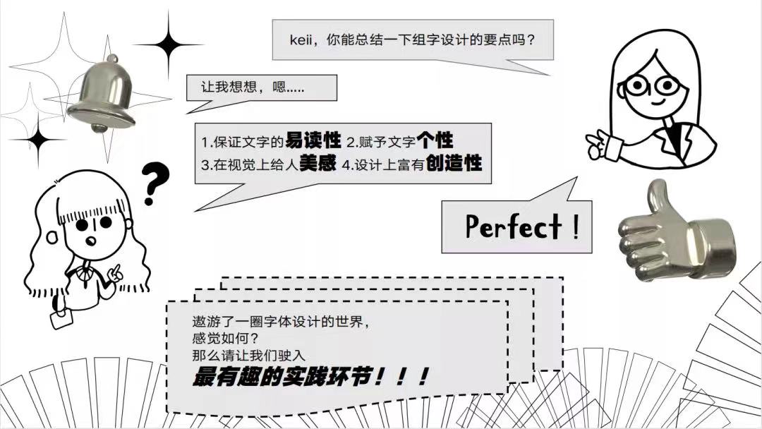 课程第二阶段在字体设计的技术学习过程中,让学生从网络和书本资料中学习教育教学的相关课程经验。收集相关资料,整理为系统的PPT文件,以小组式自我学习为主导的教育教学的方法进行学习,之后上讲台进行评讲分析,科任教师并作相应评价。