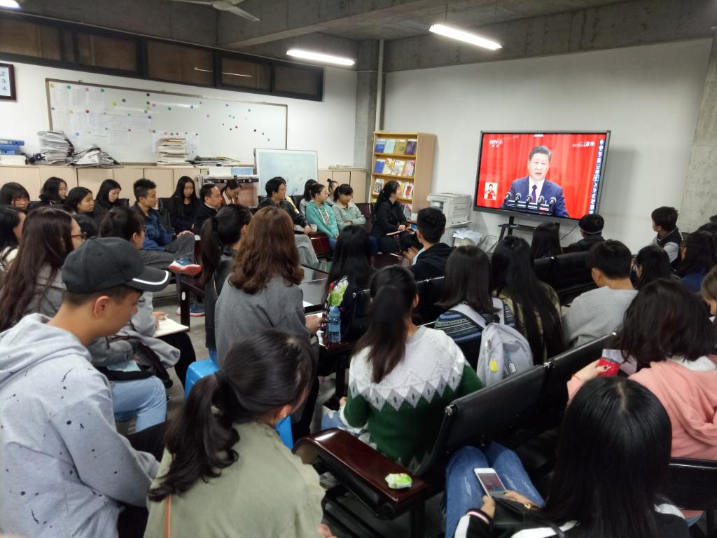 学生代表霍炫宇表示:今天满怀激动观看了十九大的开幕式,一开始习近平总书记就提出不忘初心,方得始终的大会主题,中国特色社会主义进入了新时代,2012—2017,五年的时间不算很长,却足够让中国日新月异。作为一名在校大学生,五年的时间是从一名中学生蜕变为一名优秀大学生的过程。中国共产党人的初心和使命是为中国人民谋幸福,为中华民族谋复兴,这个初心和使命是激励中国共产党人不断前进的根本动力,更不断激励在校的我努力成为学生中的榜样,发挥大学生应有的风采。