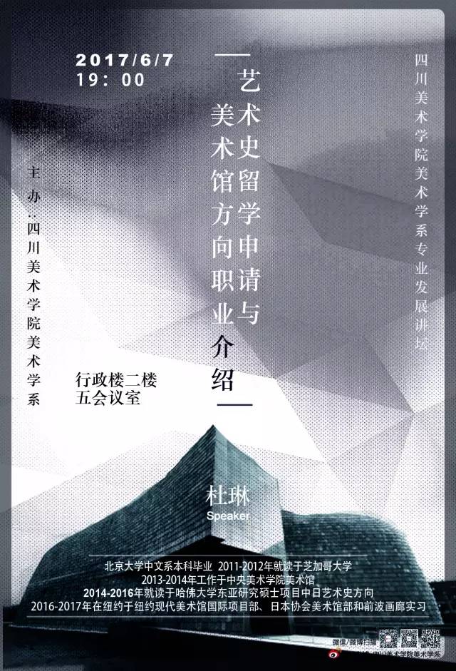 在近些年的留学热潮鼓动下,许多学生从本科阶段便立志要去美国研究生学院进行深造。然而对于本科生而言,虽然对中国现当代艺术发展和学术研究充满热情与好奇,但往往找不到研究的门路,更不知道应该如何将对艺术的热情和自身兴趣特点结合,找到适合自己的留学专业方向。这次讲座嘉宾将向川美的同学们讲述自己在国内本科求学期间与教授互动,逐渐找到研究方向的经历。这种科研经历将在留学申请当面起到关键的作用。同时,讲座嘉宾还将讲述自己对国内美术院校和综合性大学之间课程设置的差异的理解,从而向学生解释美术院校学生在申请中的优势和劣势,以及如何扬长避短。除此之外,本次讲座还将与同学们探讨留学申请的文书撰写和修改的经验与心得。