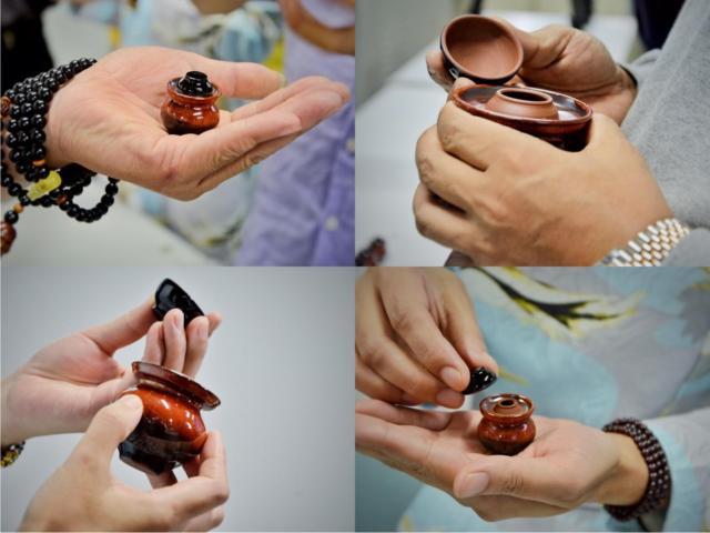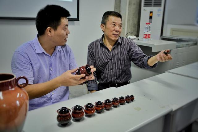 荣昌陶是中国四大名陶之一,它产自重庆市荣昌县,素来有“薄如纸、亮如镜,声如磬”的美名。荣昌的陶土粘性和可塑性极强,通过炼泥、揉泥、陈腐、创制等工艺,创制出精美的陶器,而烧制出来的陶器保鲜好、不渗漏,又有“泥精”之说。陶艺传承人刘吉芬是位民间高手,13岁便开始追随父辈学习陶艺,53年的学艺历程使他完整掌握了一整套制陶技艺,他以精制微型泡菜坛而著称,其作品多次参赛并获奖,也曾被作为礼品,赠予外国友人。这一次的座谈会上,刘吉芬和刘冬带来了他们的作品,与学员们进行交流。