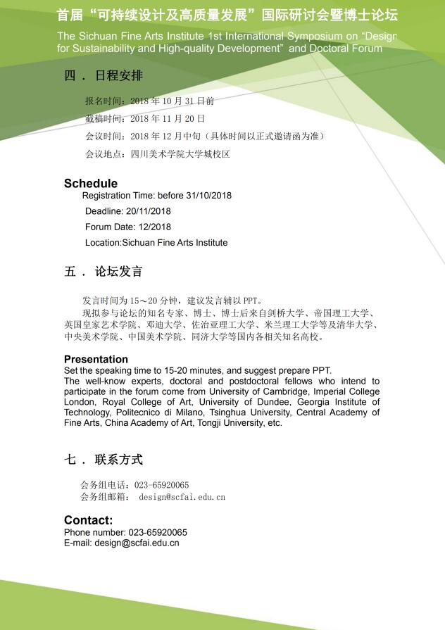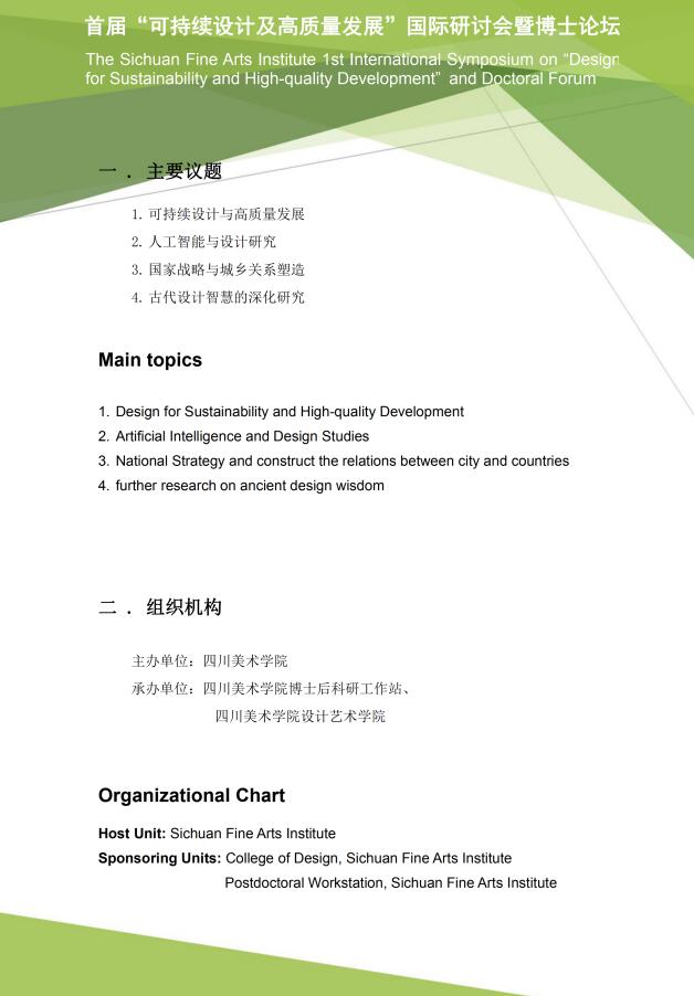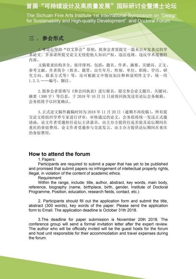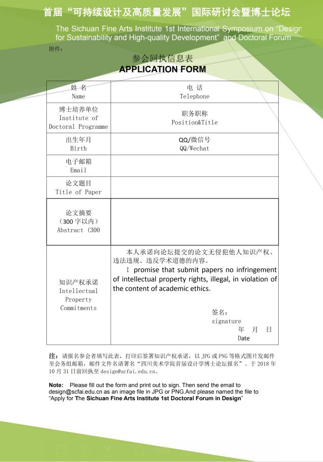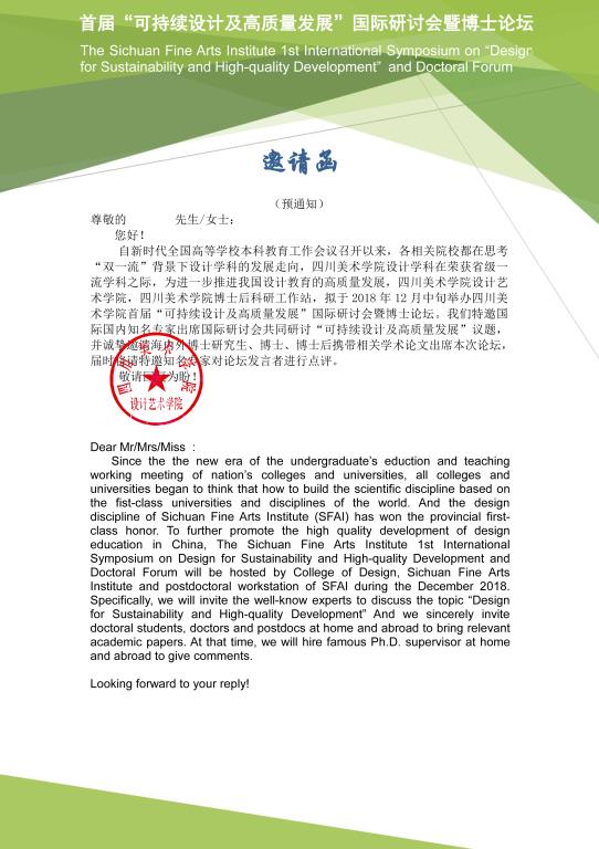 第1页 首届“可持续设计及高质量发展”国际研讨会暨博士论坛邀请函 第2页 参会回执信息表