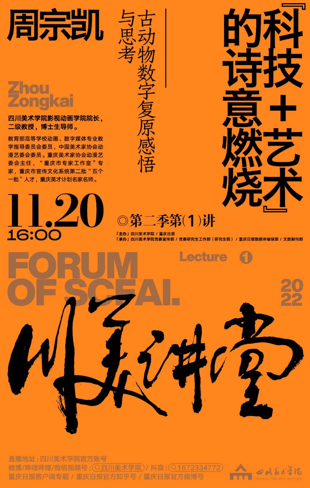 “川美讲堂”第二季共有12讲,分享嘉宾以四川美术学院研究生导师为主体,分享形式为线上平台直播。第二季第1讲将于2022年11月20日16:00在四川美术学院官方账号、重庆日报官方账号上正式推出,第1讲主题为“科技+艺术的诗意燃烧一一古动物数字复原及开发运用探索”,主讲人是四川美术学院博士生导师、影视动画学院院长周宗凯教授。欢迎关注!