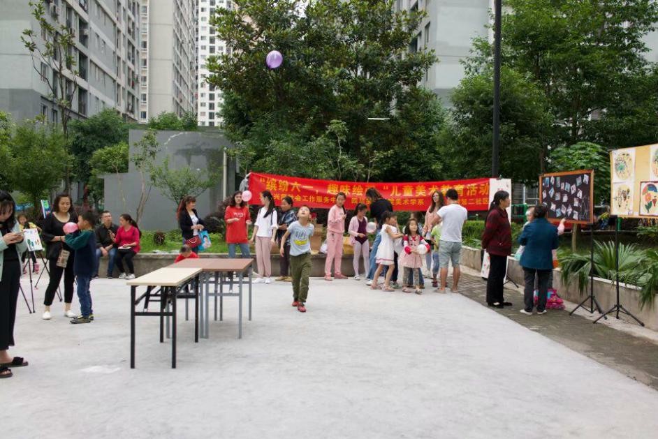 5月27日下午3:30分,由四川美术学院美术学系主办,重庆兴民社会工作服务中心协办的“缤纷六一,趣味绘画”儿童美术展览活动在康居西城第二社区举行。展览作品有儿童国画作品和丙烯绘画作品、现场还组织了趣味游戏以及现场制作等。社区居民纷纷踊跃到达现场观展和小朋友们一起欢度儿童节。