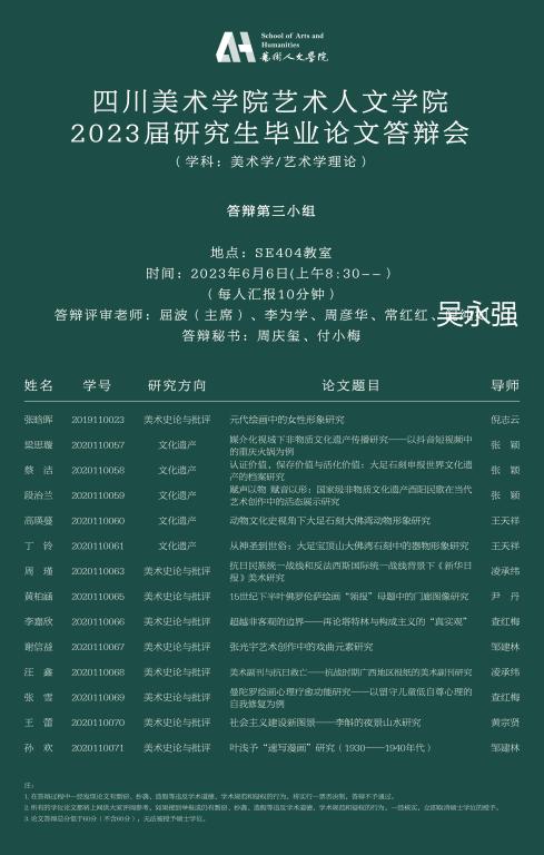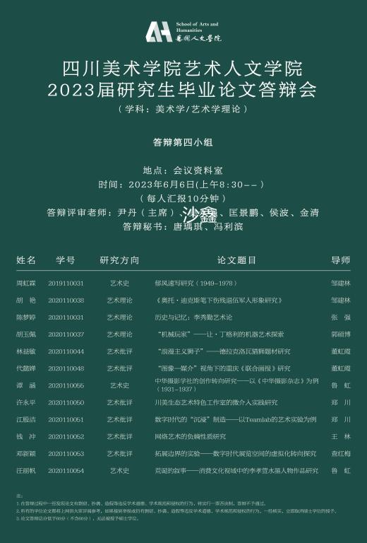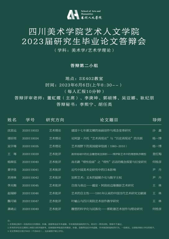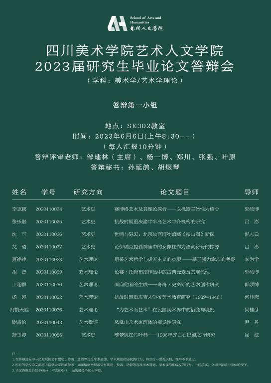 艺术人文学院将于2023年6月6日上午8点30分,在设计楼E栋SE的302、402、404教室和二楼会议室分四组开展毕业论文答辩会。此次答辩会是对同学们三年学习成果的汇报,也是为自己的硕士学习生活画上一个句号,在此我们提前预祝各位同学答辩成功!同时也欢迎想了解答辩流程、积攒答辩经验、对答辩会感兴趣的同学们前来旁听。