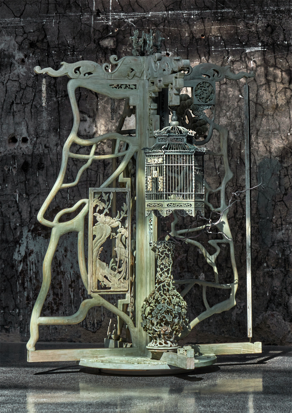《游园惊梦Wandering in the Garden,waking from a Dream》2023,木雕,120X120X170》
