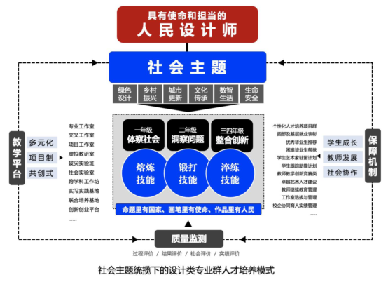 将塑造“人民设计师”的价值理念融入人才培养全过程。融合“社会问题+专业知识”设置“绿色设计、乡村振兴、城市更新”等六大社会主题,统揽构建“1(大设计通识)+1(域内专业知识)+X(交叉整合系统)”教学内容体系,强化学生“体察社会-洞察问题-整合创新”艺术淬炼,形成设计人才培养的“川美模式”。