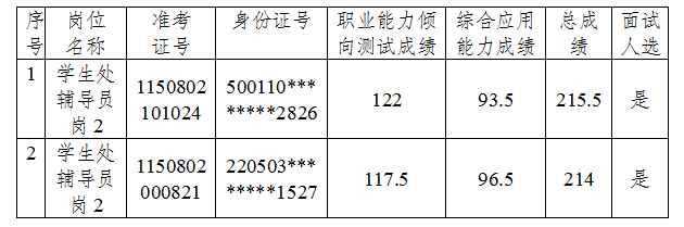 在我校2024年第一季度公开招聘事业单位工作人员资格复审过程中,招聘岗位为学生处辅导员岗2,准考证号为1150802002727、1150802101008的2位考生经确认自行放弃面试,根据招聘公告中“缺额可按报考该岗位考生笔试折合总成绩从高到低依次递补,是否递补及递补次数由用人单位报主管部门研究确定”的规定我校依次递补准考证号为1150802000109、1150802101024的2位考生,其中准考证号为1150802000109的考生经确认自行放弃面试,最终递补面试人选如下: