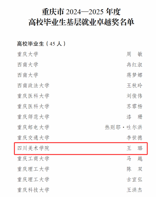 近日,《重庆市教育委员会关于2024—2025年度“高校毕业生基层就业卓越奖学(教)金”遴选结果的通报》发布,我校2021届设计学院毕业研究生王璐获评“重庆市2024—2025年度高校毕业生基层就业卓越奖”。