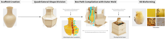 《4D Bioforming with Bees: An Industry-Compatible Prototyping Method for Polymorphic Honeycomb Creation》论文提出了一种“4D生物成型”方法,兼容传统养蜂产业的蜂巢原型制作方法,设计师与养蜂人共同合作,通过精心设计的支架引导蜜蜂筑造突破传统平板六边形的三维多态蜂巢结构,既保留蜜蜂自然筑巢的美感,又探索了新的蜂巢形态及其功能上的可能性。
