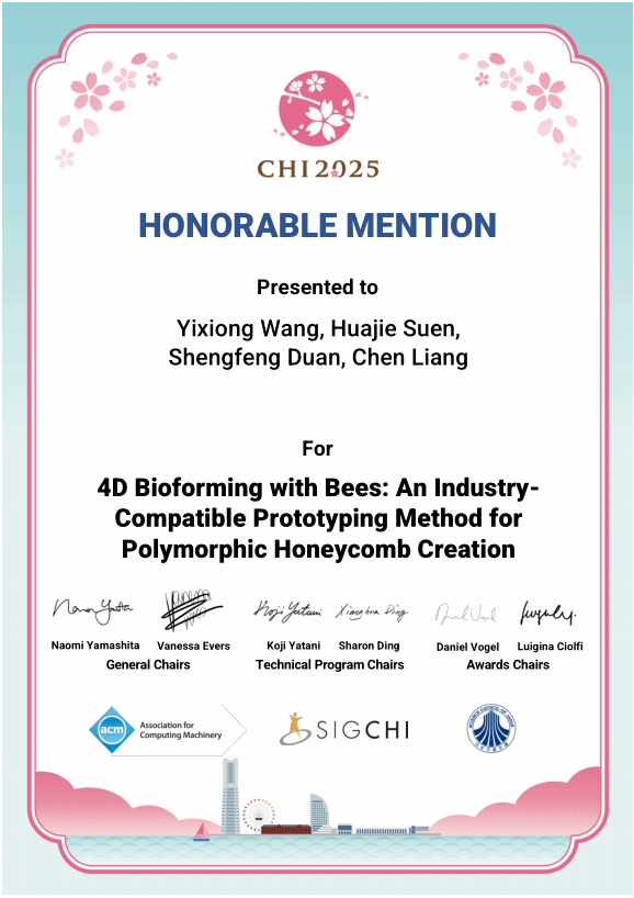近日,在日本横滨落下帷幕的人机交互领域顶尖学术会议ACM CHI 2025传来喜讯!四川美术学院设计学院师生与香港科技大学(广州)学者的合作论文《4D Bioforming with Bees: An Industry-Compatible Prototyping Method for Polymorphic Honeycomb Creation》(与蜜蜂共创的4D生物构组:一种与产业兼容的多形态蜂巢原型制造方法)不仅成功入选,更荣获大会“Honorable Mention Award”(荣誉提名奖)!这标志着该研究成果在高度竞争的国际顶级学术会议中获得了进一步的认可。