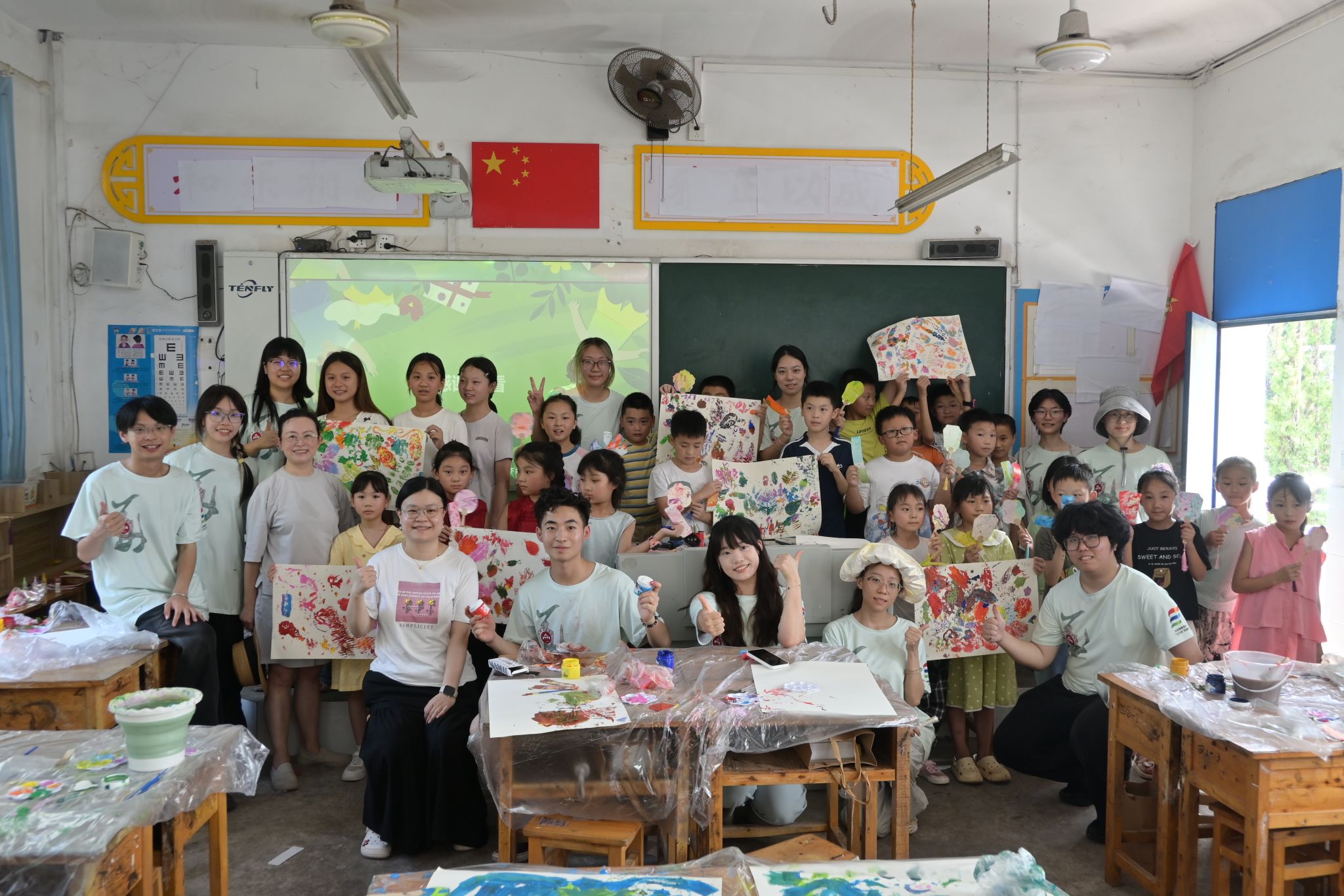 7月13日,烈日炎炎,持续高温预警,但酷暑并没有阻挡一群心系山区儿童的青年。团队走进开州区义和小学,开展“夏日艺术大冒险”美育课程。义和小学地处大巴山南坡,是一座藏在大山深处的乡镇,美育资源匮乏,团队聚焦义和小学美育课程,设计夏日分享系列活动,为孩子们送去艺术萌芽的种子。上午,团队成员们分组对老旧楼梯进行艺术改造,将自己所学绘于乡村。下午,开设非遗体验课,如传统大漆漂漆技法教学、植物拓印画创作等。孩子们在动手实践中感受艺术魅力,在画纸上留下独特的自然印记,通过艺术抒发情绪,感受自然的美好与艺术的力量。未来,团队还计划通过捐赠画材、网络授课等方式持续赋能乡村美育。