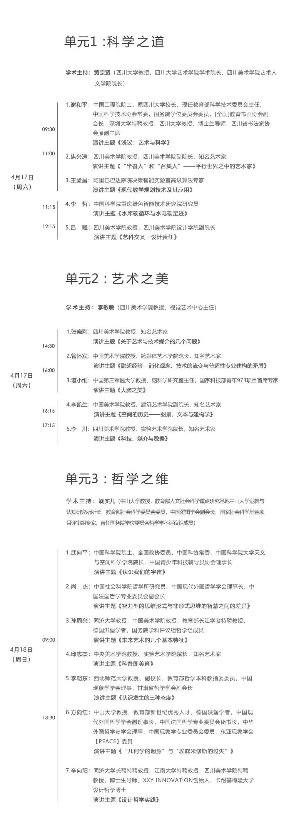 第四届哲学·艺术·科学高峰论坛将于2021年4月17日09:00在重庆市四川美术学院美术馆7号厅隆重开幕。本次论坛汇聚了来自全国哲学、艺术、科学领域的近二十位知名专家学者,将围绕“技术世界与多维未来”的主题展开探讨,分为科学之道、艺术之美、哲学之维三个学术版块。