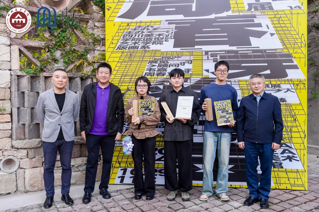 四川美术学院党委书记唐青阳、四川美术学院院长焦兴涛、周春芽奖学金发起人周春芽为“第十四届周春芽奖学金暨第十一届版画系学生作品年展”年度大奖获得者颁奖。