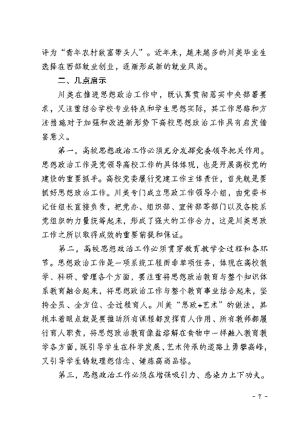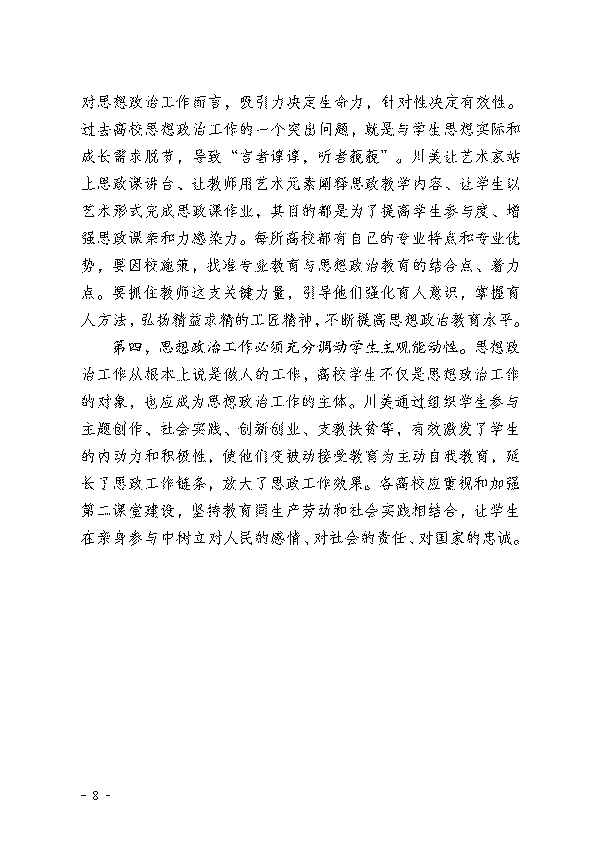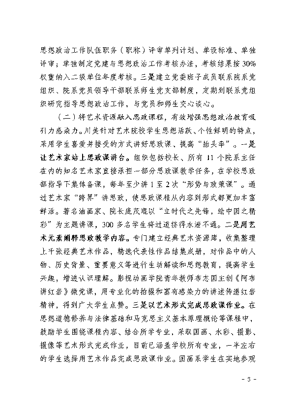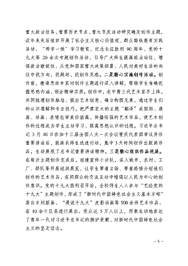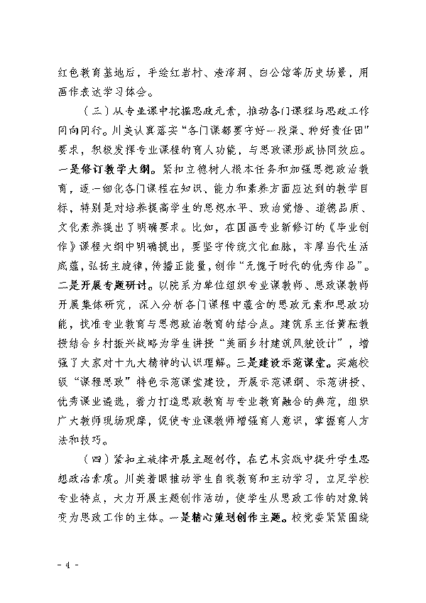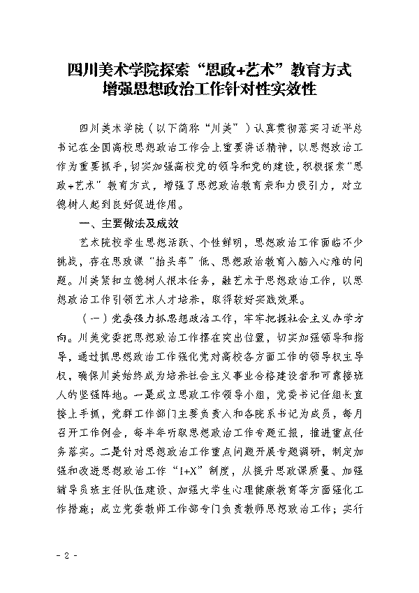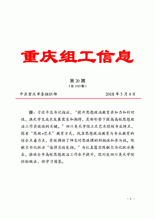 2018年5月4日,中共重庆市委组织部内部刊物——《重庆组工信息》(2018年第20期)以《四川美术学院探索“思政+艺术”教育方式 增强思想政治工作针对性实效性》为题,专题报道了我校认真贯彻落实习近平总书记在全国高校思想政治工作会上重要讲话精神,立足学校专业特点,探索“艺术+思政”教育方式,以思想政治工作引领艺术人才培养的经验做法。