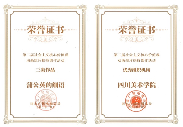 由国家新闻出版广电总局主办,教育部高等学校动画、数字媒体专业教学指导委员会协办的“第二届社会主义核心价值观动画短片创作活动”于4月25日公布优秀作品名单,影视动画学院创作动画片《蒲公英的细语》获评优秀作品,四川美术学院影视动画学院获评优秀组织机构。