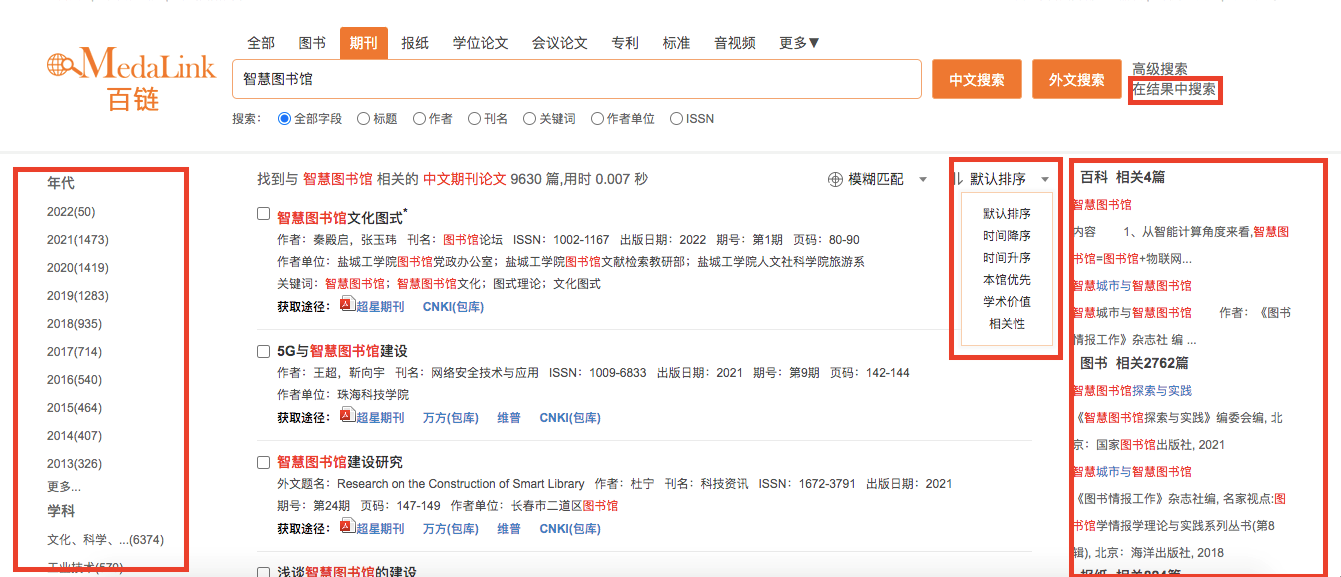 对搜索结果按类型、年代、学科等进行聚类,帮助读者精确搜索结果。