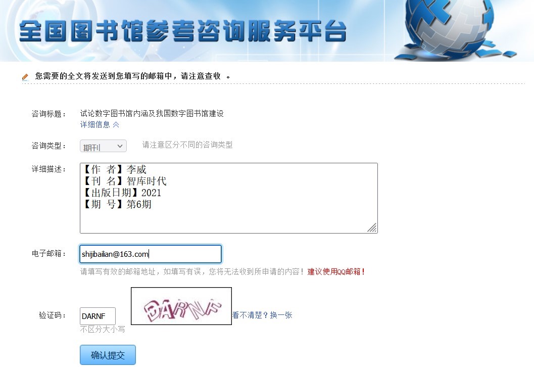 所谓文献传递,就是图书馆参考咨询中心通过E-mil快速准确的将您需要的资料发送到您自己的邮箱,供您全文阅读。此服务免费!以期刊为例,在期刊详细信息页面,您可以在如下位置点击“图书馆文献传递中心”,进入“图书馆 参考咨询服务”页面。在图书馆参考咨询服务页面,请您认真仔细填写如下信息,以确保提交无误。最后点击“确定”即可。