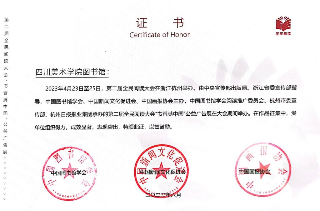 近日,在由中央宣传部出版局、浙江省委宣传部指导,中国图书馆学会、中国新闻文化促进会、中国画报协会主办的第二届全民阅读大会“书香满中国”公益广告展中,学校图书馆征集多幅我校学生作品入展,组织得力,表现突出,成效显著,荣获“表现突出单位”称号。