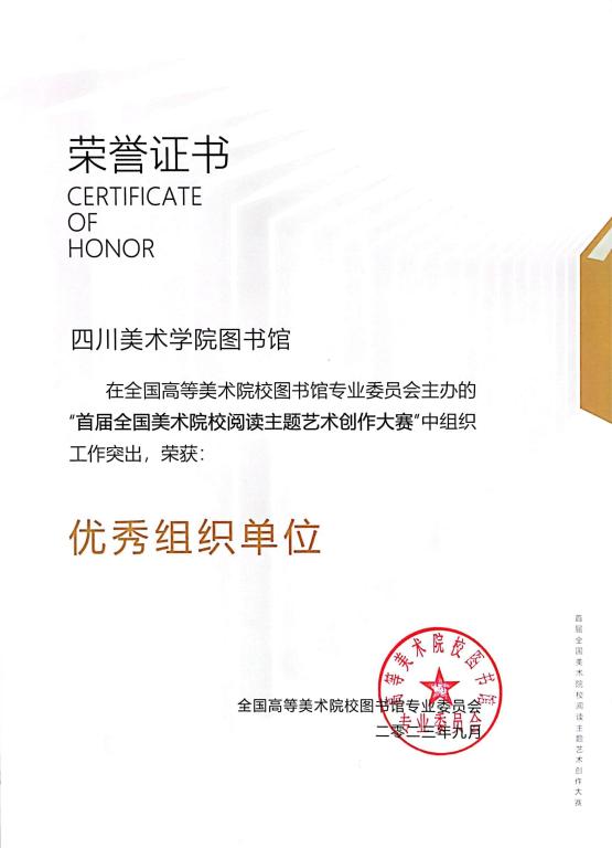 在由全国高等美术院校图书馆专业委员会主办、多所美术院校图书馆承办的首届全国美术院校阅读主题艺术创作大赛中,图书馆早谋划、抓统筹、谋实效,成果丰硕:图书馆获“优秀组织单位”荣誉称号;我校多名学生获“数字媒体作品”银奖、“美术作品”铜奖、“设计作品”铜奖、“美术作品”优秀奖、“设计作品”优秀奖;多名教师获“优秀指导老师”和“优秀组织个人”称号。本届大赛以“阅读与美,通文达艺”为主题,面向全国各高校美术和艺术院系师生,征集阅读主题相关的艺术作品,包括美术作品、设计作品、数字媒体作品、摄影作品四类作品。大赛共征集作品4598件,由评审团在总评现场进行投票与评议,共评审出267件获奖作品。我校本次获奖作品将有机会推送至第二届全民阅读大会“书香满中国”公益广告展,并入选《中国阅读文化创意设计精选作品年鉴》,在全国各图书馆公益巡展。