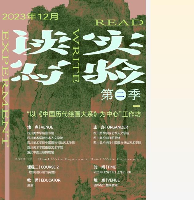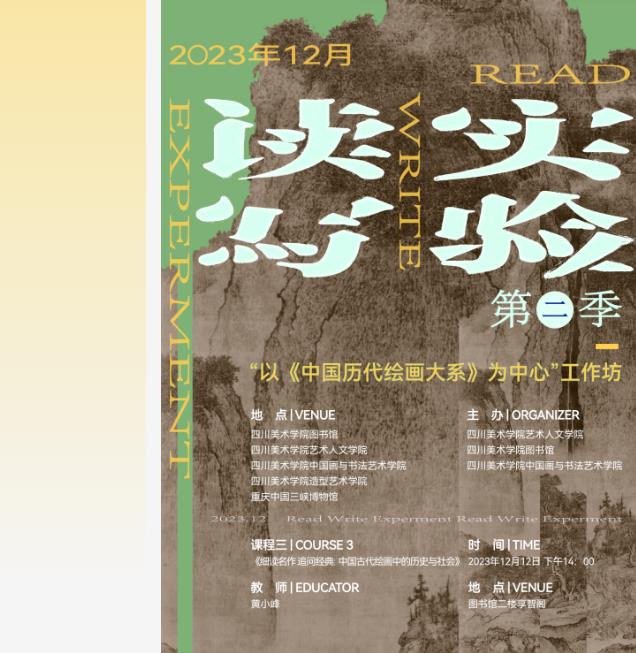 2023年12月12日,由艺术人文学院、图书馆、中国画与书法艺术学院主办的读写实验(第二季)——“以《中国历代绘画大系》为中心”工作坊课程在四川美术学院图书馆享智阁开展,此次课程分为两个主题,分别为课程二《如何进行读写实验》和课程三《细读名作 追问经典:中国古代绘画中的历史与社会》,课程由图书馆副馆长屈波主持,工作坊学生参加。