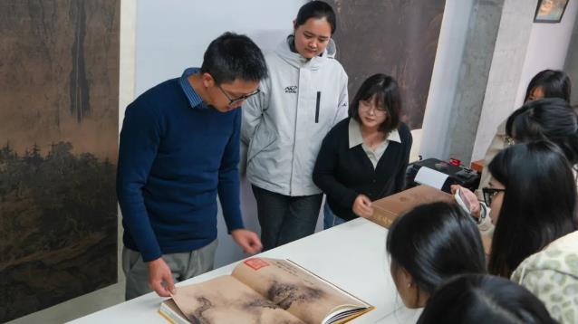 在现场观摩环节,屈波带领学生一同前往四川美术学院图书馆特藏室,以现场悬挂的三件古画仿真品《桃源仙境图》《溪山行旅图》《万壑松风图》为例,现场演示了“如何进行读写实验”,并鼓励学生们需要增加读写训练,逐渐形成建立在感性认识基础上的理性表达的读作品的习惯。