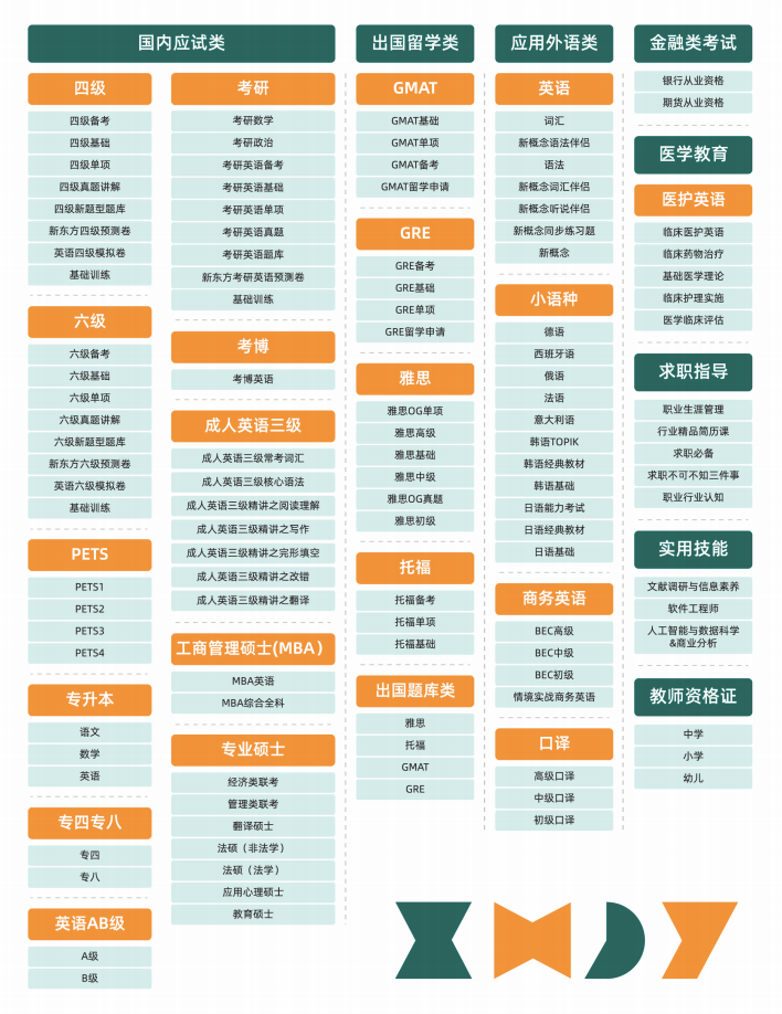 新东方提供上百种资源,满足应用外语、职业认证、实用技能、学历提升、职场晋升等需求。