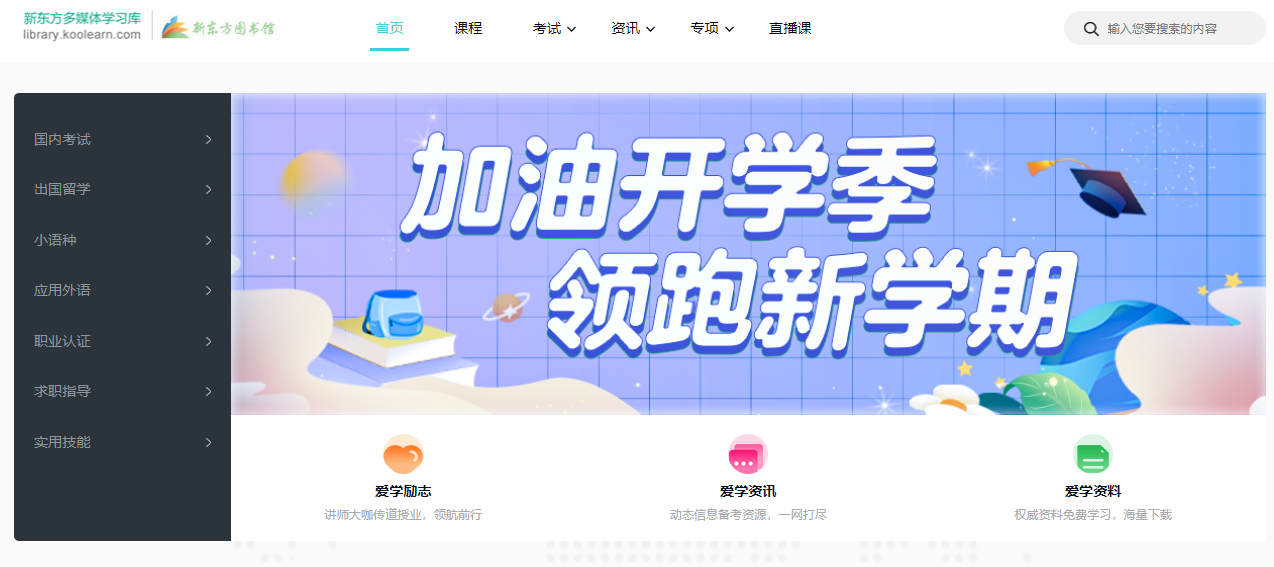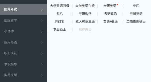 方法1:从左往右看,左侧是课程模块的快捷入口,展示关于国内考试、出国留学、小语种、应用外语、职业认证、求职指导以及实用技能的内容。