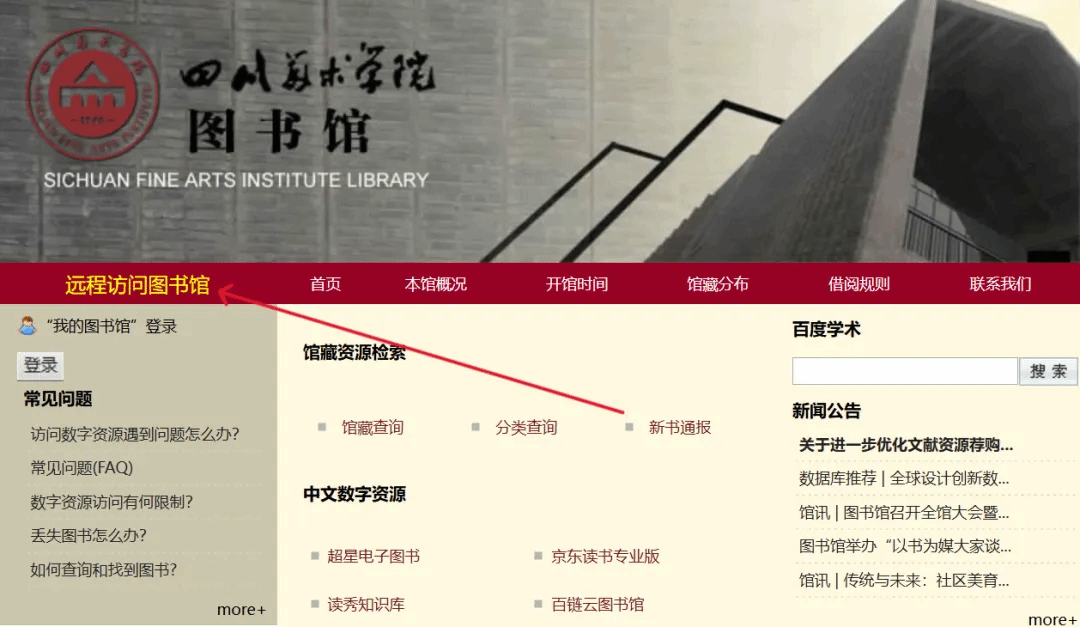 一、访问四川美术学院图书馆官网(http://www.scfai.edu.cn),在官网左上方点击“远程访问图书馆”,通过统一身份认证登录后,即可访问图书馆数字资源。