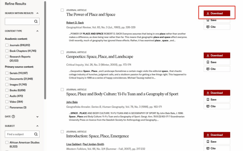 5. 获取全文:对于需要查看全文的文献,用户可以通过点击“查看全文”或“PDF全文”等链接,获取文献的PDF格式全文。(注:部分未订购的期刊,个人用户注册MyJstor后,每月可获得6篇在线阅读全文的服务。)