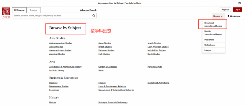 2. 选择浏览方式:Jstor提供了学科、标题、出版社、图像等多种浏览方式。如:选择按学科浏览,用户可以根据自己的需求,按照学科分类查找期刊,每个学科下都会列出该学科收录的期刊数,方便用户快速定位。